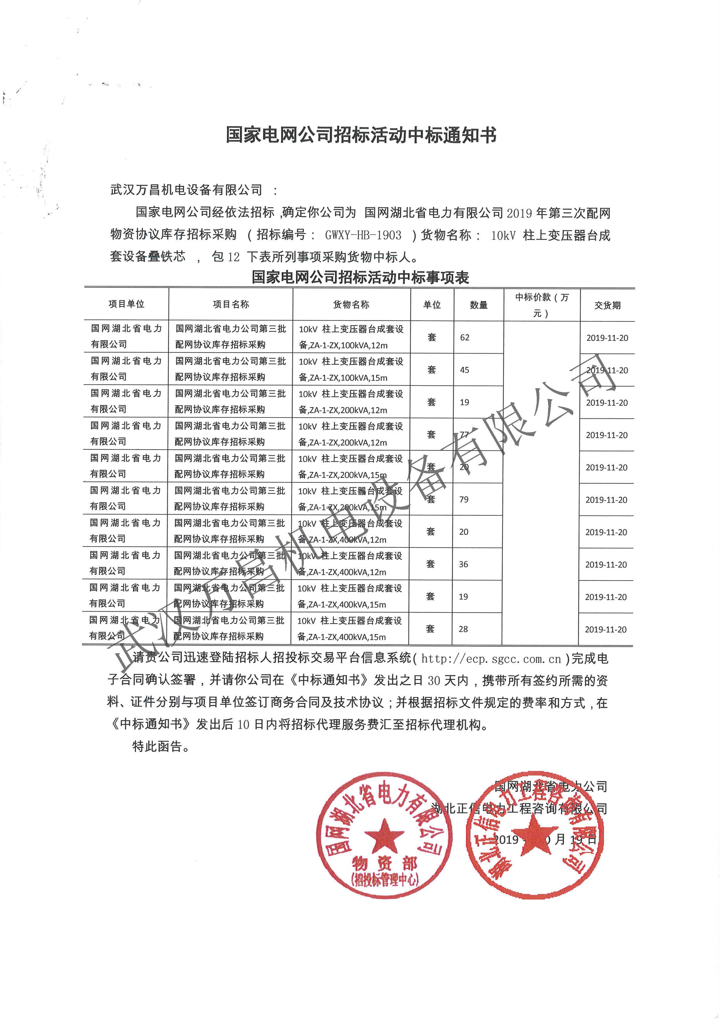 2019年中標國網(wǎng)湖北省協(xié)議庫存項目
